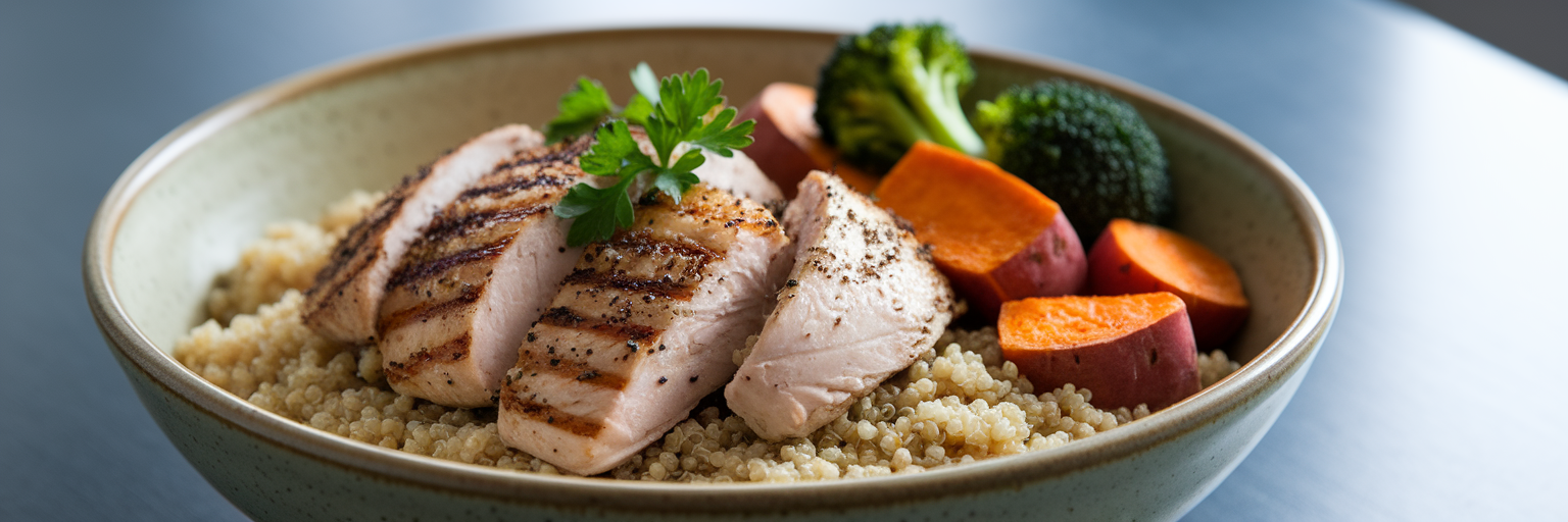 Balanced meal bowl with chicken and quinoa.